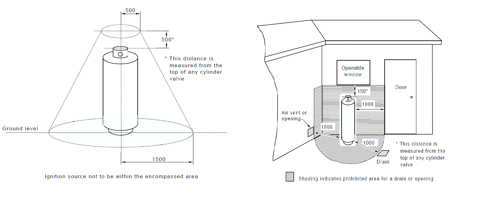 Below are two diagrams from the Australian Standards showing the exclusion zone of all drains, windows, doors, Vents & Power sources (PowerPoints, Aircon units, etc.) from a cylinder.